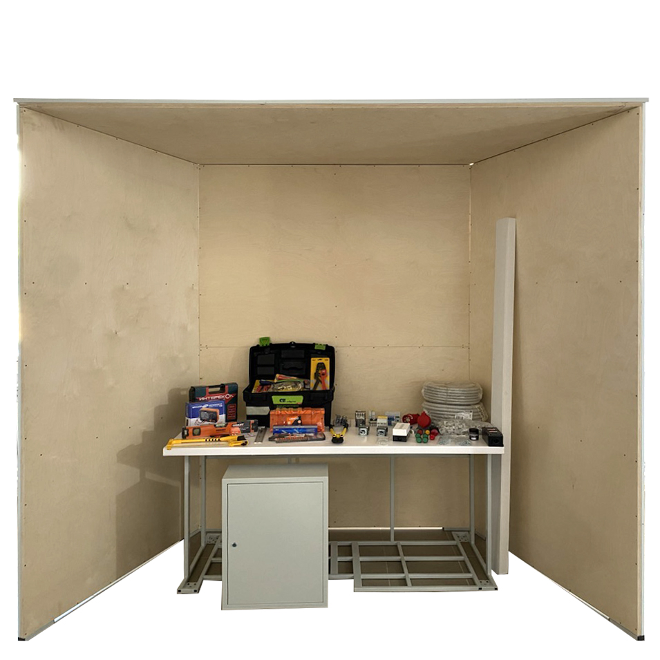 Комплект учебного оборудования «Электромонтаж и наладка систем управления в максимальной комплектации» должен представлять собой рабочую кабину и комплекты для реализации различных схем электромонтажа. Рабочая кабина предназначена для реализации различных схем электромонтажа. Рабочая кабина состоит из металлического сборно-разборного каркаса с закрепленными на нем листами фанеры.