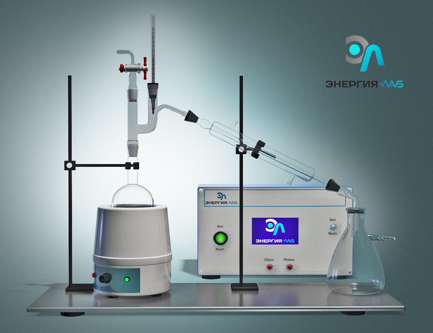 Лабораторная установка состоит из двух частей: комплекта оборудования для исследования перегонки жидкости при уменьшенном давлении (под вакуумом) и блока управления.